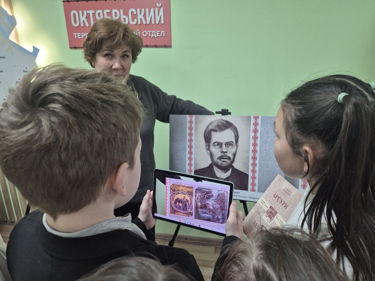 В феврале в рамках дня родного языка в Октябрьской сельской библиотеке прошли громкие чтения поэмы Федорова М.Ы. «Леший» («Арҫури»). На фотовыставке с применением технологии дополненной реальности портрет писателя оживает перед зрителем: Федоров М.Ф. улыбается, видеоролик рассказывает о жизни и творчестве писателя, земляк писателя - житель деревни Итяково Афанасьев Ю.Г. читает отрывок поэмы «Леший» («Арҫури»). А дальше дети сами продолжили громкие чтения поэмы «Леший». «Леший» («Арҫури») –лиро-эпическая поэма, любимое произведение всего чувашского народа. В ней собраны многие прелести чувашского языка и народной мудрости, они соединены между собой так искусно, что все воспринимается как единый, цельный кусок изумруда. В темном лесу Федор пугается лешего настолько, что не в состоянии собирать хворост. Развязка - убежав из леса, Федор успокаивается, задумывается о происхождении лешего и своей жизни. Герой стремится выжить, избежать позорной смерти. Но и дома у героя не все благополучно: Таким автор видит жизнь чуваша. Федор не только беден в материальном отношении, но и суеверен. Слышанные когда-то народные предания о мифических существах он принимает за правду, так как далек от науки. Мифический персонаж «леший» встречается без исключения у всех народов Поволжья, в том числе, у чувашей. Чаще всего его называют Арсури (Арзури - ударение на последний слог), также второе название – варман тура (лесное божество, лесной дух, хозяин леса). Юные читатели с интересом изучали лексику поэмы "Лешего". При встрече с незнакомыми словами они обращались к толковому словарю.