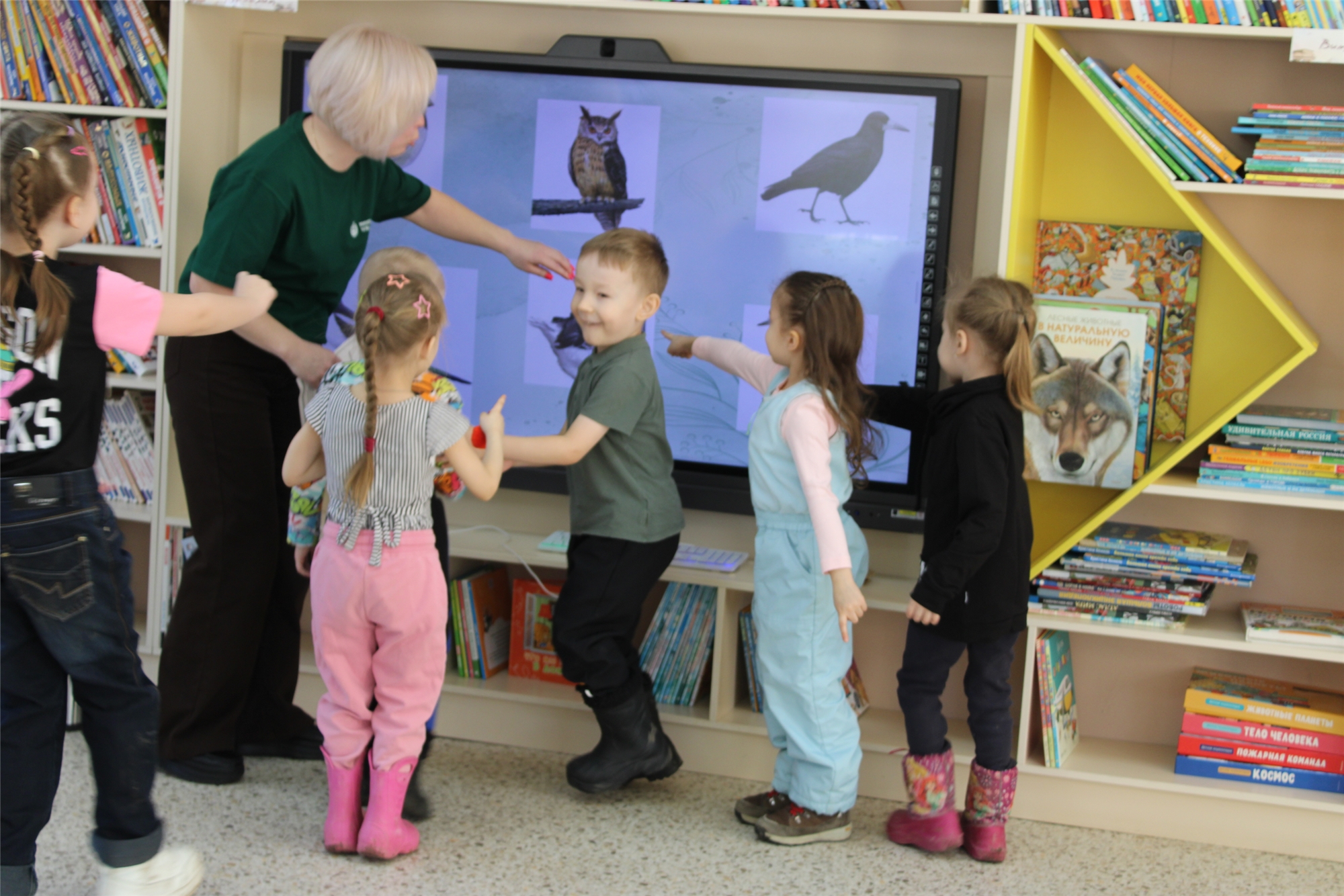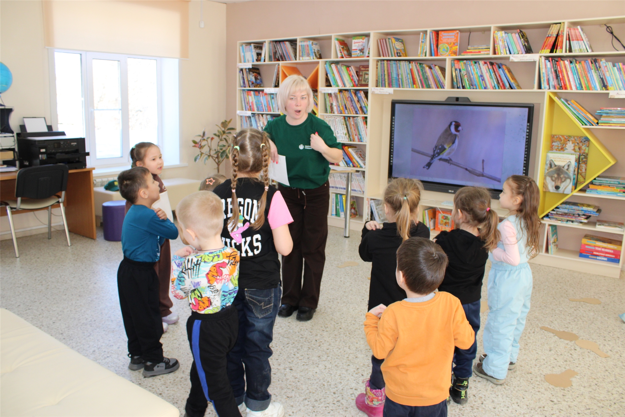 Первая встреча информ-досье «Птички – симпатички» стала для малышей знакомством с миром птиц населяющих территорию Чувашии. По карте Чувашии малыши обсудили разновидности, места обитания пернатых, рацион питания и заботу о потомстве. Особую атмосферу создало веселое отгадывание загадок. Дети с восторгом определяли знакомых птиц, живущих по соседству, и с удовольствием рассматривали их изображения на экране. После небольшой разминки юные экологи отправились в виртуальный поход в Государственный природный заказник «Водолеевский», и узнали, что заказник получил свое название от деревни Водолеево, раскинувшейся на высоком правом берегу Волги, в семи километрах от города. В его южной части находится впечатляющая колония серых цапель, насчитывающая более 100 гнездящихся пар! Познакомившись с птицами ребята с азартом поиграли в игру "Цапля и лягушки". Следующим пернатым героем стал филин из рассказа Михаила Пришвина «Филин». Ребята послушали рассказ, живо сопереживая главному персонажу, размышляя, о том, удалось ли филину спастись от собаки Свата. Далее состоялось знакомство с щеглом с просмотра видеоролика. Особенно удивительным знанием для ребят стало открытие его "синдрома попугая" – стремления воспроизводить услышанные звуки. Завершилась насыщенная программа участием в игре «Кот и воробьишки», которая помогла закрепить полученные знания о птичьих привычках и особенностях.