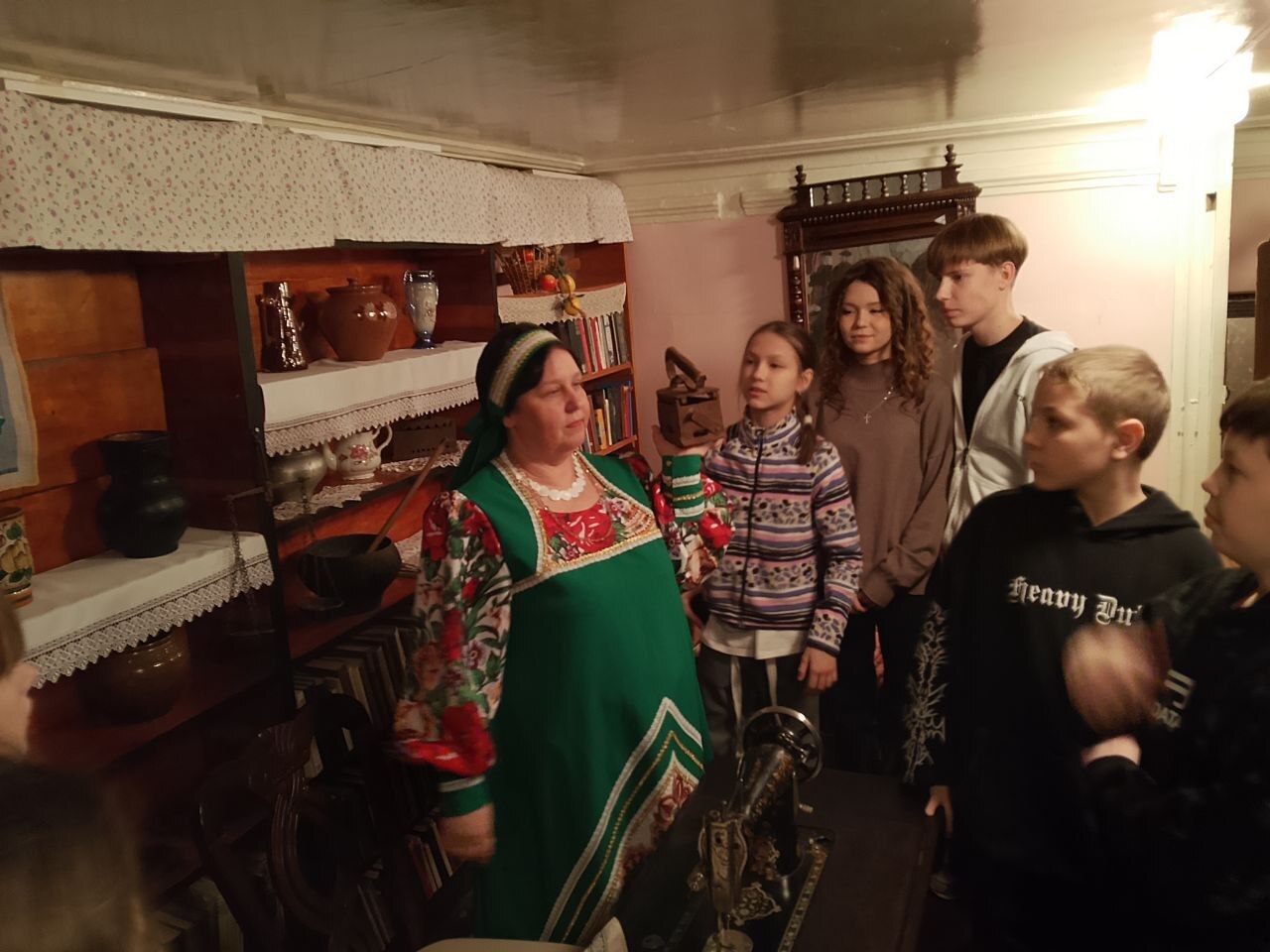 Особое внимание привлекает интерьер библиотеки, воссоздающий обстановку купеческого дома. Резные шкафы, бархатные стулья и атмосфера книжной комнаты создают ощущение присутствия в прошлом. Рассказ библиотекарей в купеческом образе добавляет аутентичности происходящему, делая историю живой и доступной для восприятия детей.